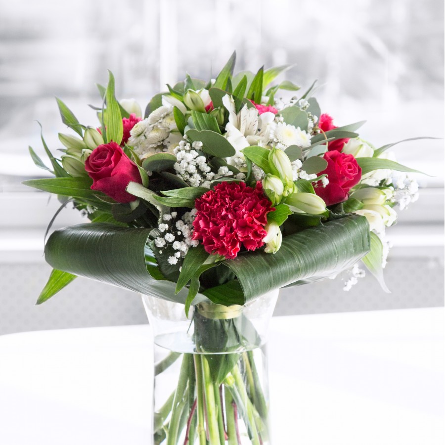 Brighten any occasion with our Vibrant Carnation & Rose Bouquet, a unique arrangement that combines the passion of red roses with the sweetness of carnations and white chrysanthemums. Gypsophila adds a light, airy touch to this stunning bouquet.